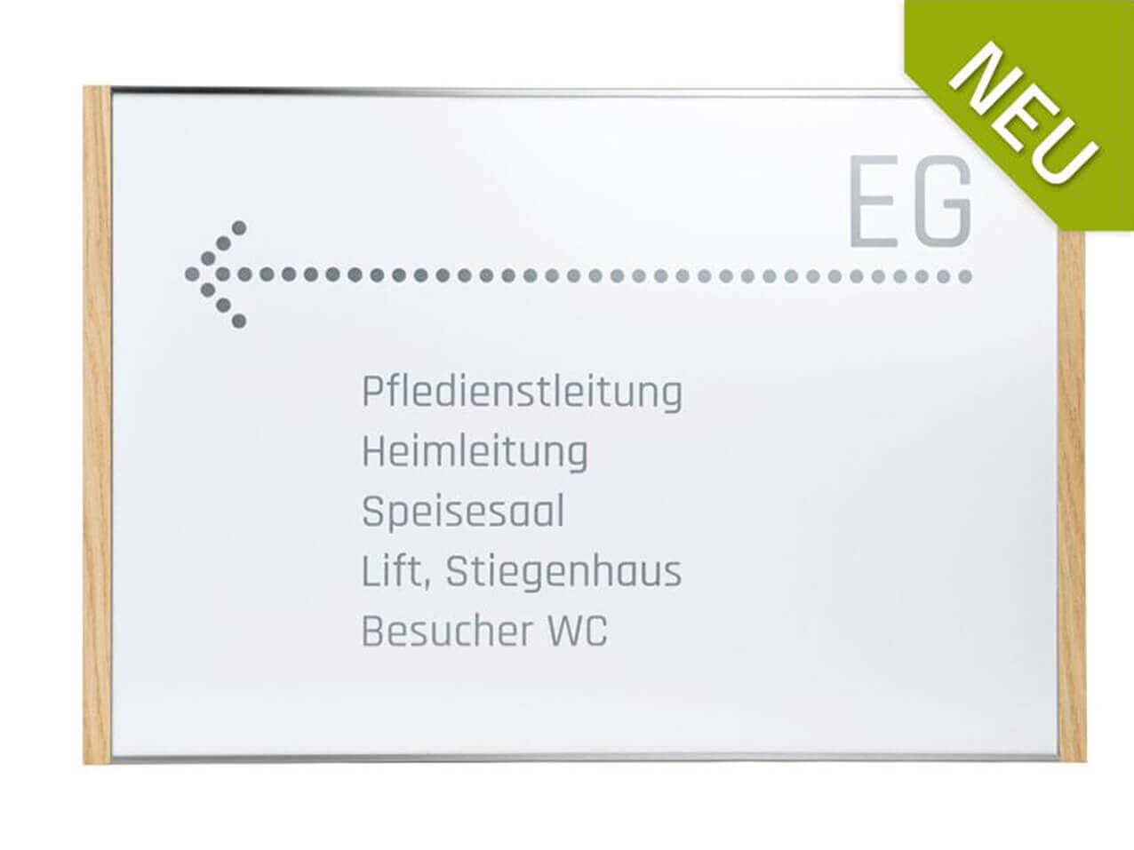 Diese neuen Orientierungsschilder, Türschilder mit Wechselrahmen aus Holz Eiche sind sehr flach. Der dezenter Rahmen mit nur 20 mm Breite gibt diesen Wechselschildern ein modernes natürliches Aussehen. Das obere Rahmenelement kann ohne Werkzeug einfach nach oben herausgeschoben werden. Die Beschriftung können sie günstig mit einem 120g Papiereinleger bedruckt einlegen. Die Schildermontage ist auch sehr einfach, einfach mit Powerklebeband, oder Montagepowerkleber an Wand, Tür kleben. Durch die Größenvielzahl der Türschilder, Wandschilder können kleine Lagepläne, Saalpläne, Raumauszeichnungen, Menüplan beschildert werden. Sie dienen auch als Etagenschild, Fluchtplan, Orientierungsschild, Wegleitsystem, Infoschild. Wir führen auch die Montage bundesweit, in Österreich im Hotel, Gaststätte, Büro, Industriegebäude, Seniorenheim, im Krankenhaus, in Behörden gerne für Sie aus.