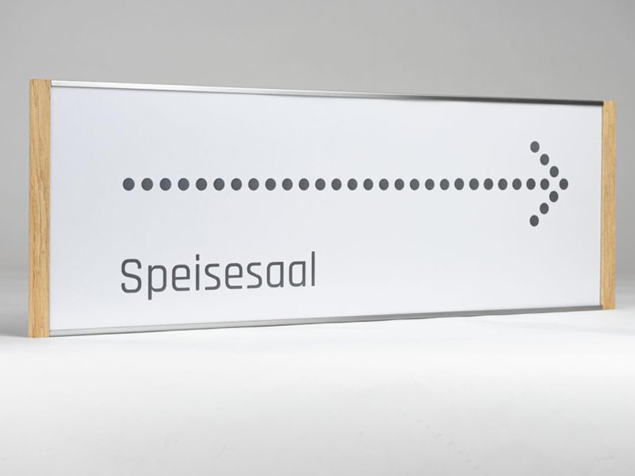 Hier sehen Sie einige Detailbilder vom Schilder Leitsystem, Schildersystem Holz Eiche mit Aluminiumrahmen.