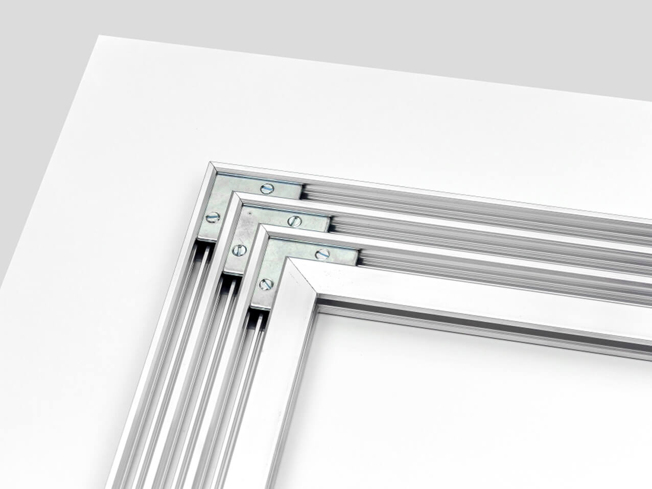 Wir haben 3 verschiedene Rahmenprofile, wie für leichte Wandbilder mit einer geringen Schattenfuge, oder mittelschwere Bilder, sowie Schwerlast Rahmen für schwere Bilder, Bildapplikationen, Galeriebilder. Der Rückrahmen sollte umlaufend ungefähr 10 cm kleiner sein als das Schild. Der verdeckte Halterahmen ist bestens für Bilder, Fotos, Galerieprint, Schilder, Platten, im Büro, Wohnung, Firma, Hotel, Industriehallen geeignet.